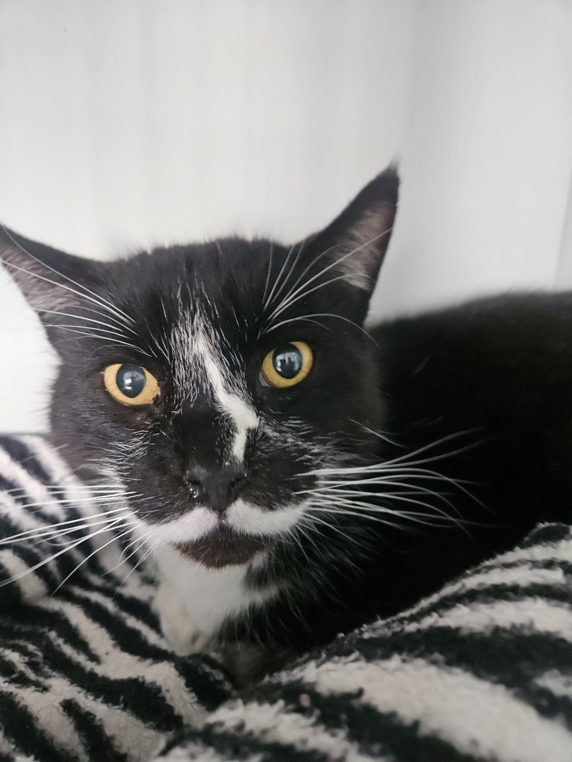 Meet GMO, our ultimate gentle giant! This big black-and-white boy has a heart as big as his size and a face that instantly steals your heart. Affectionate, calm, and irresistibly sweet, GMO loves chin scratches, snuggles, and lounging by your side, purring contentedly every step of the way.