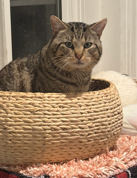 Meet Goliath, our gentle giant with a heart as big as his name! From the moment he came into our care, it was clear that this sweet brown tabby was all about love, cuddles, and companionship. He adores being carried like a baby, following you around for pets, and flopping over for belly rubs—his affection knows no bounds.